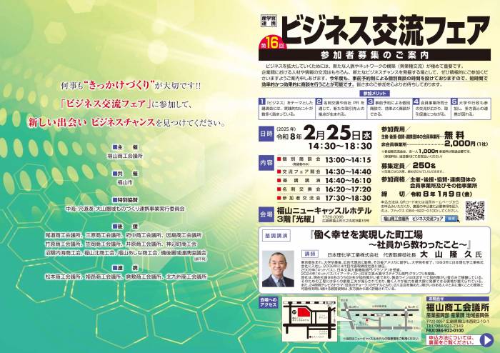 福山商工会議所では、企業間における人材や情報の交流はもちろん、新たなビジネスチャンスを発掘する場として、第16回ビジネス交流フェアを開催します。